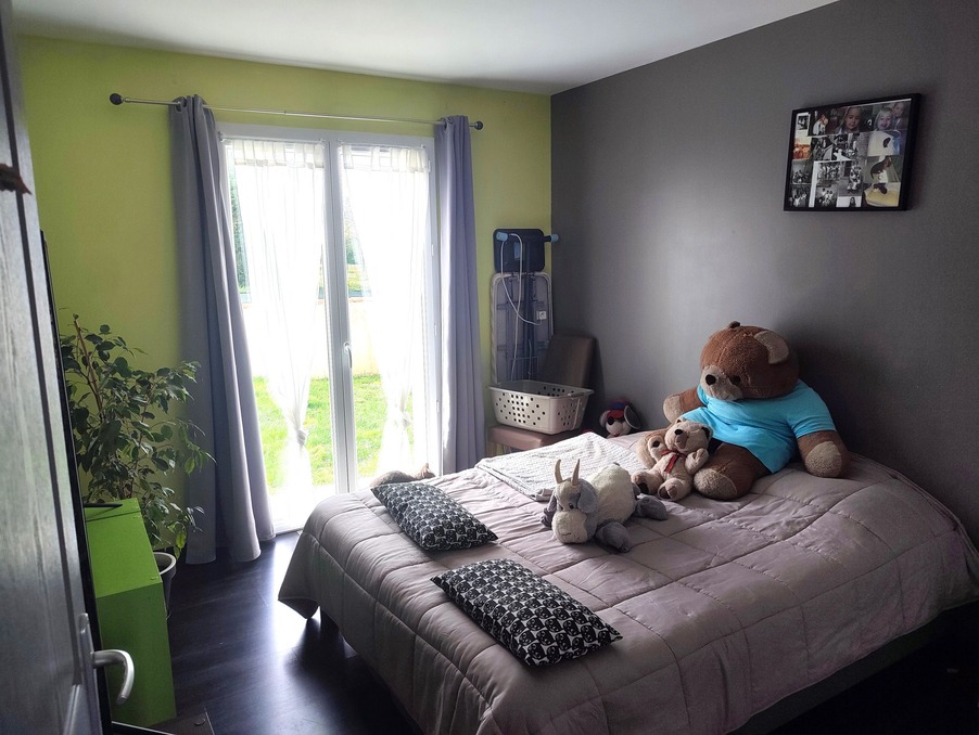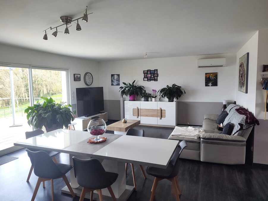 A proximité de tous services, commerces et écoles (1,8 km du centre-ville), très belle maison contemporaine (2015) RT2012 de plain-pied implantée dans un quartier calme et résidentiel, très lumineuse, offrant une surface habitable de 93 m² environ : vaste pièce à vivre traversante de 44 m² avec cuisine équipée ouverte sur salon-salle à manger avec baie vitrée ouvrant sur terrasse, 3 grandes chambres avec placards, salle d'eau, wc. Pompe à chaleur. Chauffe-eau thermodynamique. Garage à vélos. Grand vide sanitaire. Terrasse et balcon offrant une superbe vue dégagée sur la campagne. Terrain de 1049 m².