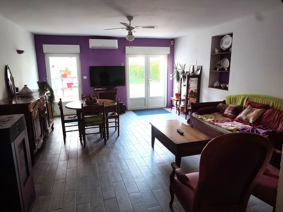 Située au cœur d'un bourg avec commerces de proximité, pharmacie et maison médicale, charmante maison ancienne rénovée de 124 m² environ comprenant au rez-de-chaussée : grande cuisine aménagée, salon de 32 m² avec poêle à granulés, salle d'eau, wc, et à l'étage : deux grandes chambres, salle d'eau-wc. Toiture refaite. Véranda. Cuisine d'été. Garage et abri voiture. Jardin de 392 m².